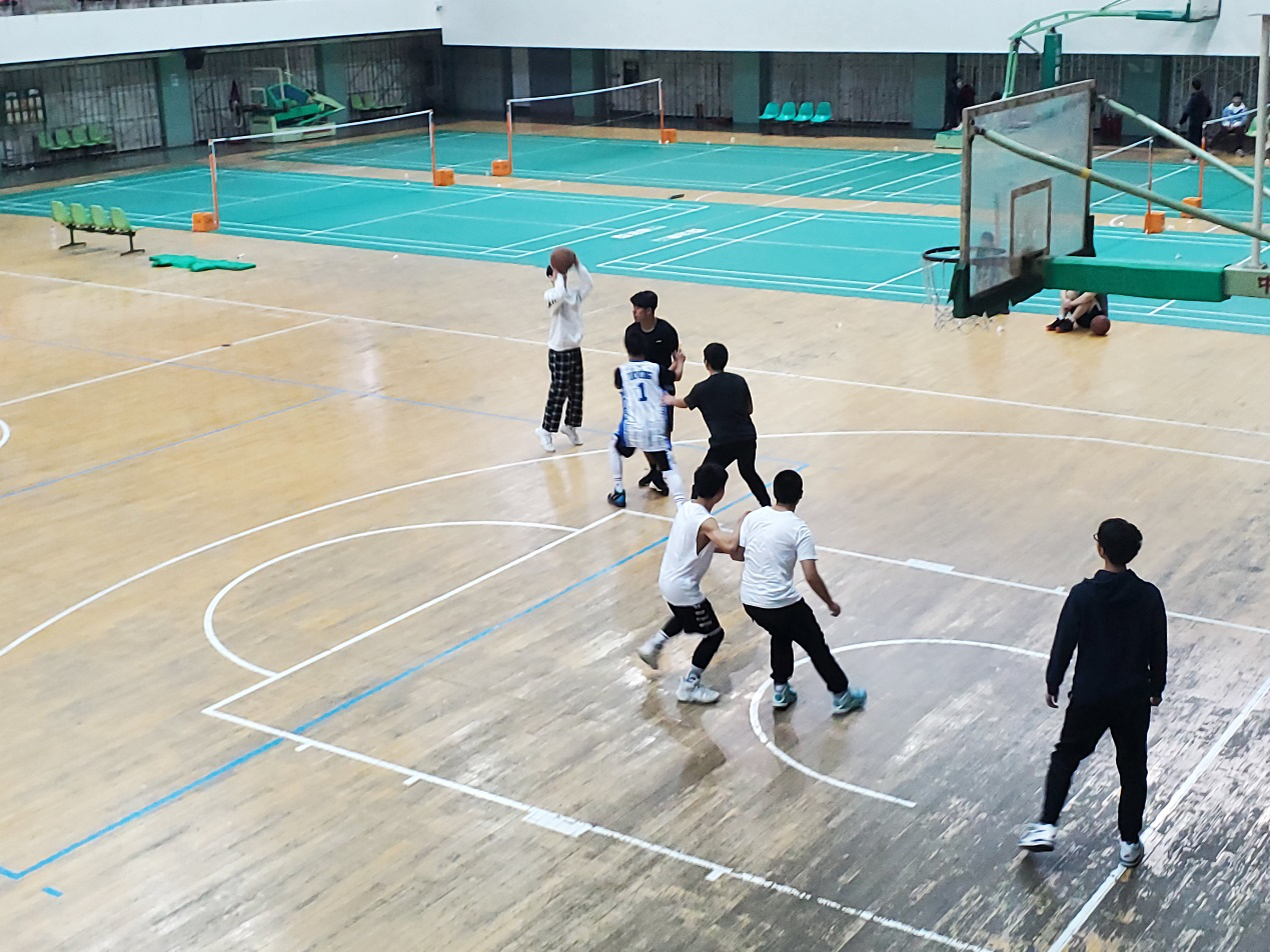 中午12时,四支队伍分别来到南岭校区体育馆篮球场。由“国庆假日八连胜队”对阵“孙昊和他的四个替补队”,“象牙山队”对阵“四个大腿队”。比赛一开始,四支队伍就迅速进入状态,分秒之间两个场地便热火朝天,两场比赛竞争都极为激烈,火力全开。专注,拼搏,双方队员以百分百地热情向观众们呈现这精彩的一战。其中“四个大腿队”和“象牙山队”的比赛尤为激烈。象牙山队上半场失误较多,错失几个得分良机。而“四个大腿队”则紧密配合,稳扎稳打,抓住对方漏洞连续得分。尽管在上半场的末尾,“四个大腿队”有球员不小心受伤下场,但他们依旧凭借着顽强的精神和积极的拼抢,战胜了强敌。另一边,“国庆假日八连胜”队同样凭借着出色的防守的组织战胜了实力强劲的“孙昊和他的四个替补队”。